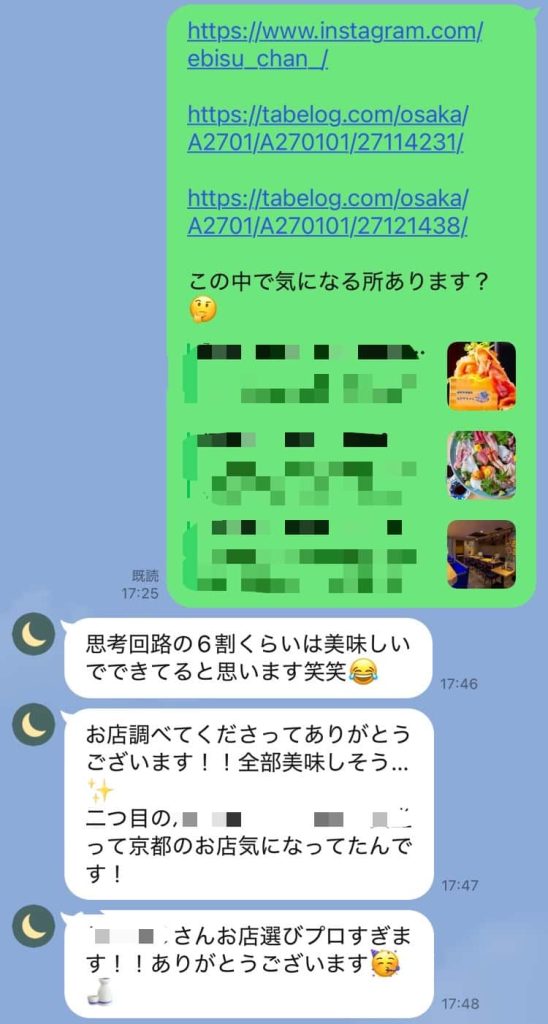 やりとりの中で「好きな食べ物」と「苦手な食べ物」を聞いて、それに合わせて3~5種類ぐらいのお店を選んで、最終相手に「この中で気になるところある?」と投げて決めてもらうのがいいです。