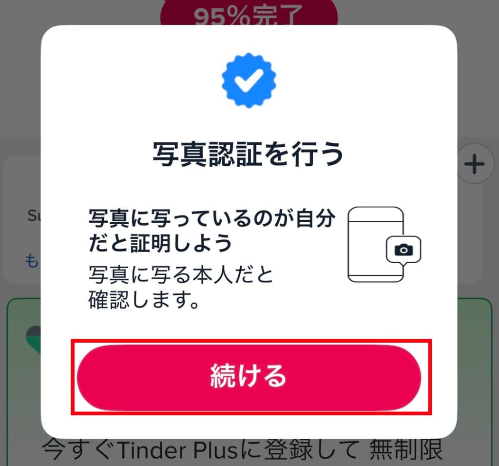 自分の名前や年齢が出てる横に透明のチェックマークがあり、そこをタップすると「写真に認証を行う」か聞かれるので、画像の赤枠の続けるをタップ