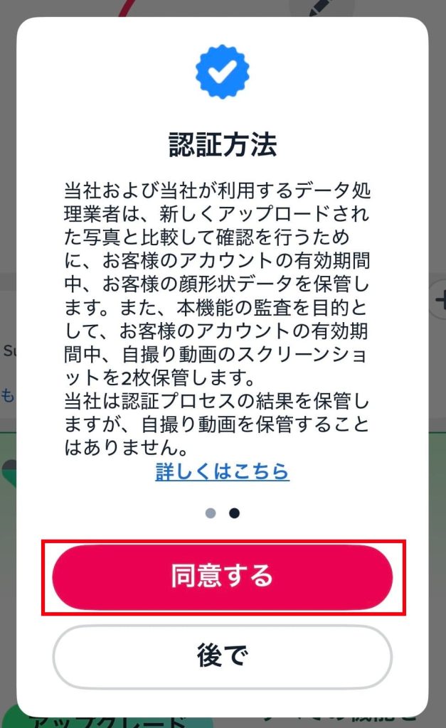 すると、認証方法の説明などが書かれてるので、よく読んで問題なければ画像の赤枠部分を順番にタップ。