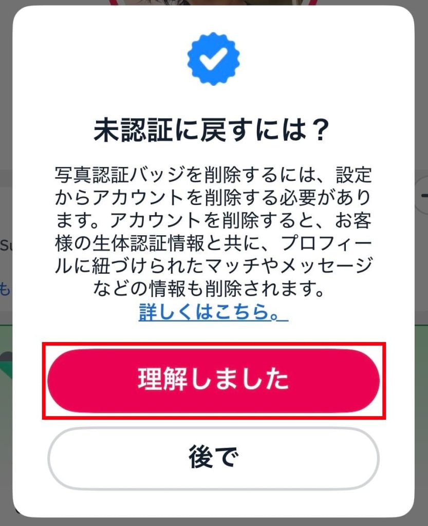 ブルーバッジ(青いチェックマーク)がプロフィールに表示されることによって、アプリ側からなにか特別な恩恵を受けれたりするわけではないですが、信頼度が高くなって女性と連絡をとることがスムーズになったり、マッチ率が上がったりとメリットの方が大きい印象です。